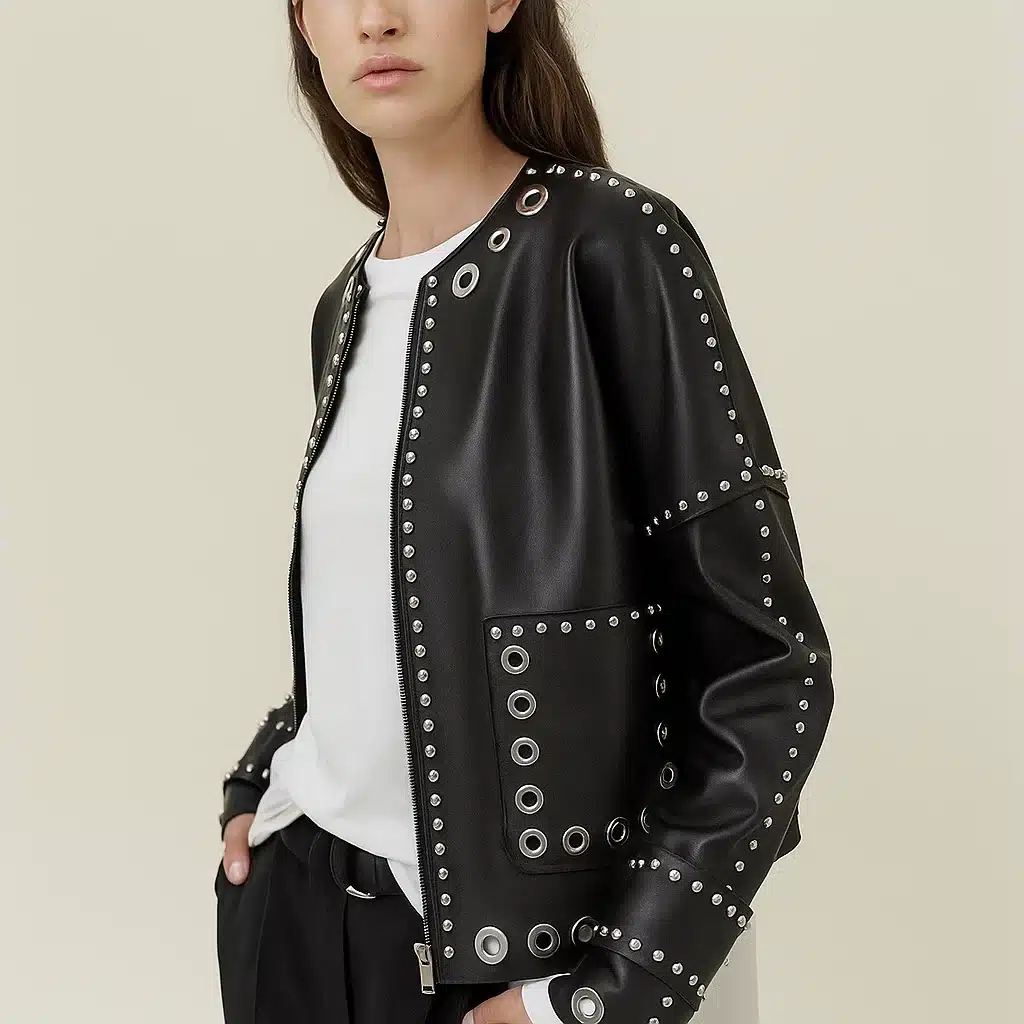 Biker chocolate con tachuelas y ojales metálicos, estilo moderno y atrevido, ideal para looks con personalidad.
